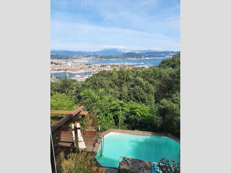 Immobiliare Eurocasa propone ad un attimo dalla città, in zona collinare, con vista mozzafiato su tutto il golfo, villa indipendente in sasso su tre piani, con piscina ed area esterna immersa nel verde. Si accede all'abitazione dal primo piano in veranda completamente coibentata con doppi vetri e fornita di stufa a legna per potere usufruire della splendida vista anche in pieno inverno. Dalla veranda si entra nel soggiorno e nello studio/camera singola. Dalla scala a chiocciola si può accedere al piano secondo dove c'è la zona notte o al piano inferiore dove si trova la cucina. La zona notte al piano secondo mansardato è costituita da camera matrimoniale con annessa cabina armadio e bagno con doccia. Piano terra, ampia dispensa/ripostiglio, lavanderia, bagno, ampia cucina (con lavandino in marmo) da cui tramite portafinestra si accede all'area esterna attrezzata con tavolo, zona barbecue, scalinata che porta alla piscina immersa nel verde e ulteriore terreno di proprietà terrazzato.