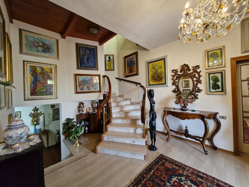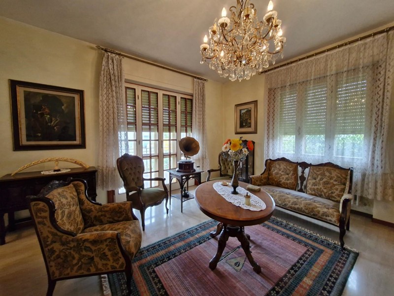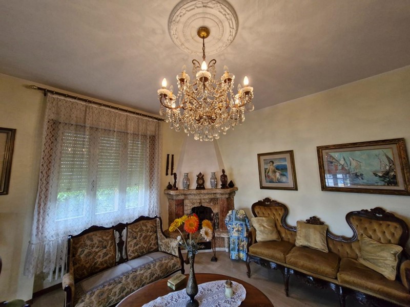 Villa indipendente a due passi dal centro con ampio giardino. L’immobile ha una superficie di mq 287 ed è composta al piano rialzato da un porticato in entrata, un ampio ingresso, sala pranzo, cucinotto e ampio soggiorno con camino, tre scalini collegano il piano rialzato con il piano terra dove troviamo un soggiorno con camino, un cucinotto un bagno ed un locale di sgombero. Grazie ad una piccola scala si accede al piano primo composto da un lungo corridoio che mette in comunicazione il bagno, tre camere matrimoniali di cui una con balcone ed un piccolo studio.