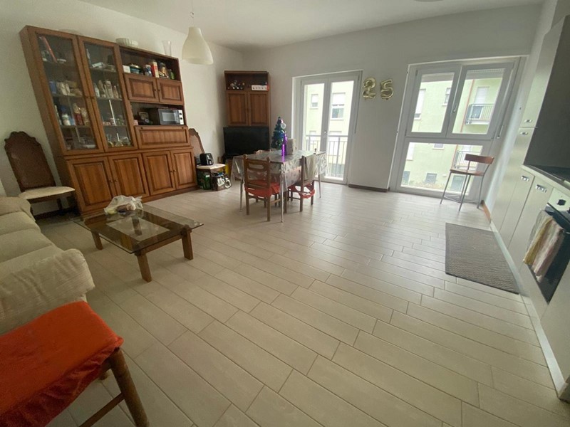 Ingresso su ampio e luminoso soggiorno con angolo cottura e accesso diretto al balcone