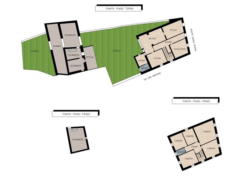 L'immobile al suo interno è composto da ingresso, soggiorno, salone con camino, cucina, studio, disimpegno e bagno al piano terra e cinque camere, di cui due con vista su Piazza, disimpegno e bagno al piano primo.