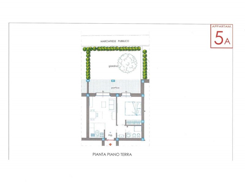 Appartamento 5, al piano terra in nuovo complesso residenziale con ingresso in soggiorno con angolo cottura, accesso ad ampio portico e giardino di mq. 29, disimpegno, bagno, camera matrimoniale con cabina armadi. Posto auto. Ottime rifiniture. Riscaldamento a pavimento, climatizzato, impianto fotovoltaico. Ottima esposizione. Altre soluzioni visionabili in agenzia.