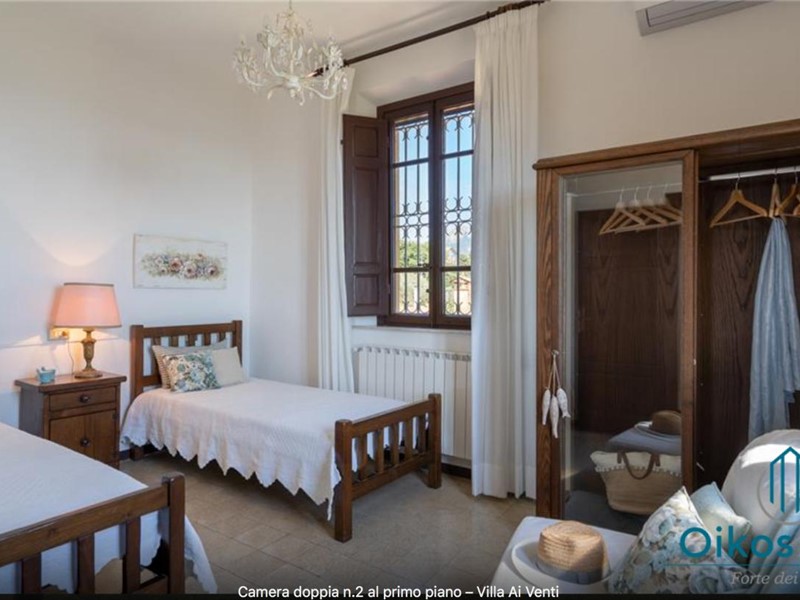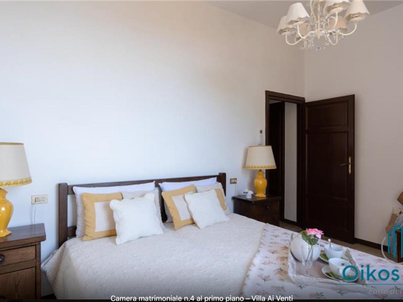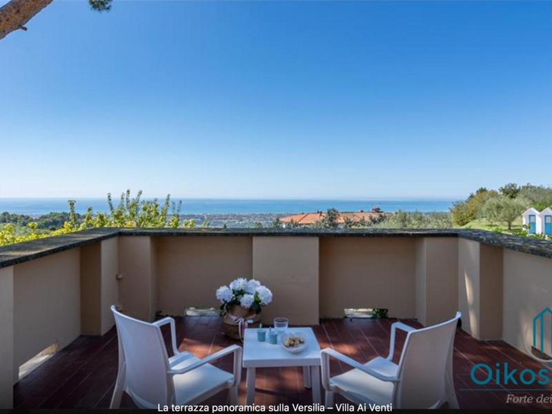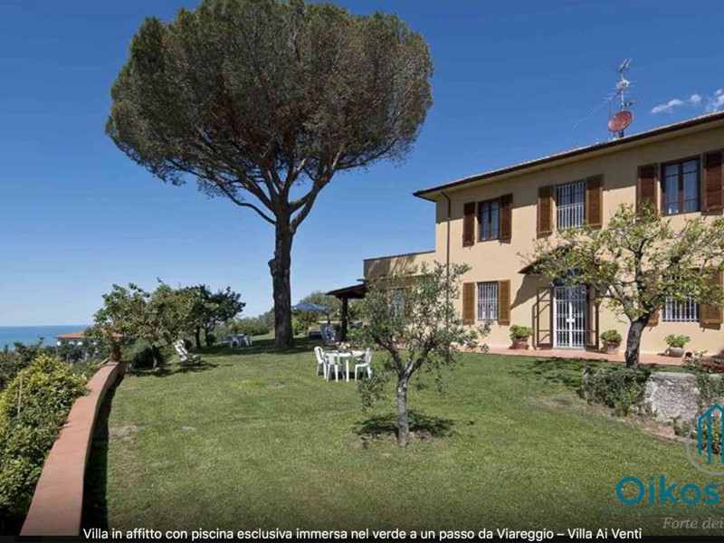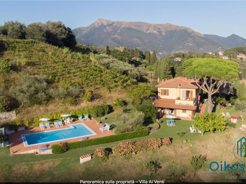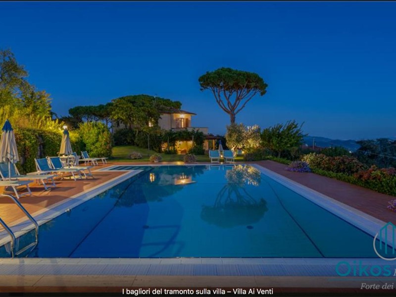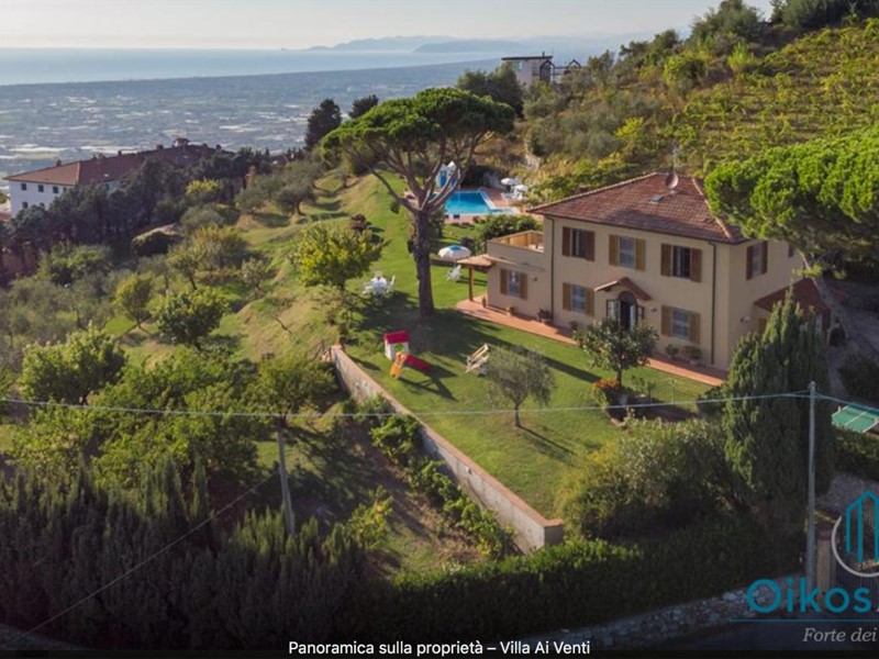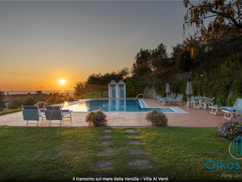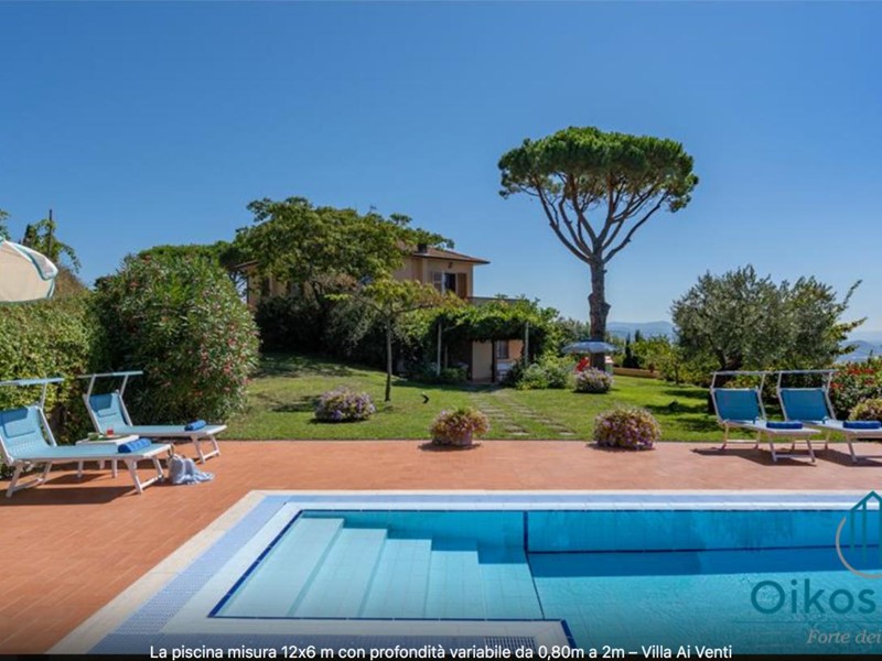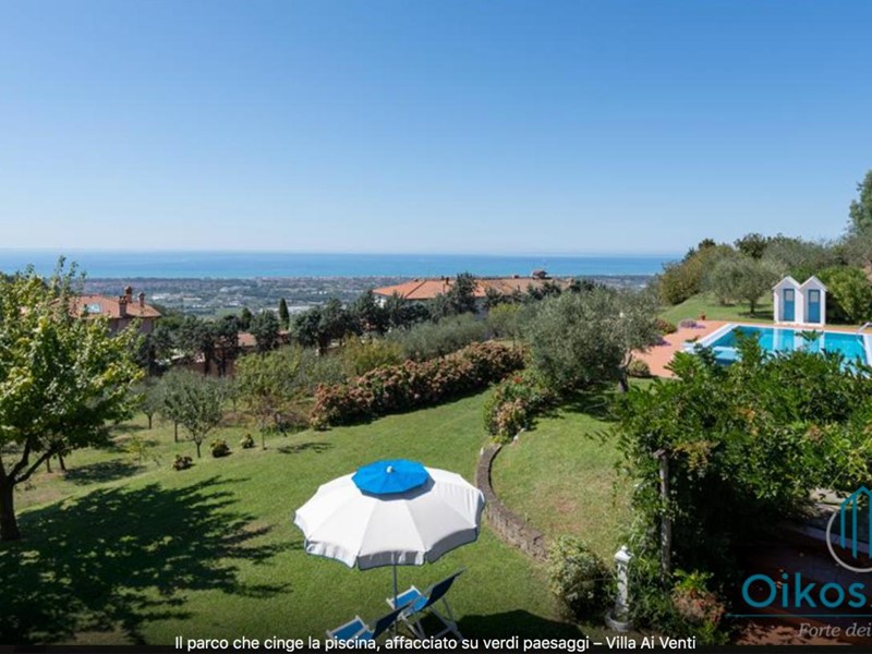 "Interni: Villa ai Venti è composta dal pianterreno ed un primo piano. Si accede alla casa attraverso il porticato che si apre su un open space con sala pranzo e soggiorno con il camino (solo ornamentale) con accesso diretto al giardino attrezzato. A lato del soggiorno, si accede alla cucina attrezzata e ad uno studio con camino, un bagno con doccia e ripostiglio con lavanderia con porta finestra che da sul retro del giardino. Tramite una rampa di scale in pietra serena, si accede al piano superiore, composto da tre camere matrimoniali, una camera a due letti e due bagni, uno con doccia ed uno con vasca. Parco: La villa è circondata da 2 ettari di terreno distribuiti tra l’oliveto e vigneti la cui raccolta dell’uva avviene intorno ai primi di settembre. Alle zone a prato si alternano aree di verde tipico della zona, perfette per godere della massima tranquillità che il contesto assicura. Adiacente alla casa, vicino alla zona dedicata al parcheggio, si trova un’area per volley ed il tavolo da ping-pong. Sotto il porticato attrezzato con barbecue, tavolo da pranzo e salottino in vimini si gode della vista della piscina e della bellissima vista sul mare e sul Lago di Massaciuccoli o Torre del Lago Puccini dove d' estate nel Teatro all' aperto dedicato al Maestro, si rappresentano le sue Opere, Tosca, Madame Butterfly, Turandot, Cavalleria Rusticana ed altre ancora. Piscina: La piscina a sfioro su tutti i lati domina lo strepitoso panorama che generosamente si offre da questa suggestiva posizione; è collocata su un terrazzamento di fronte alla villa e dista circa 30 m. Di forma rettangolare, con zona solarium in cotto e vasca rivestita in ceramica, misura 12x6 m con profondità variabile da 0,80m a 2m. L’impianto di depurazione è a cloro ed è impreziosita dalla illuminazione sia interna che esterna. La zona intorno alla piscina è dotata di spogliatoio, lettini, sdraio ed ombrelloni. Per ulteriori informazioni, potete contattarci o venirci a trovare presso la nostra sede OIKOS REALE STATE in Forte dei Marmi (LU) alla via Trento n. 45/A."
