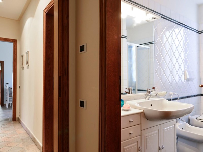 Dalla cucina si accede al garage, al ripostiglio, alla stireria/lavanderia e a un bagno di servizio con uscita esterna.