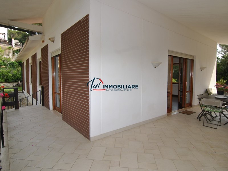 Tre sono gli accessi disponibili alla abitazione: il principale è quello per il piano terra rialzato che si raggiunge salendo una scalinata in pietra, passando per la ampia terrazza panoramica coperta, con vista mare, dalla quale si entra nella luminosa sala doppia, con finestre e porte finestre.