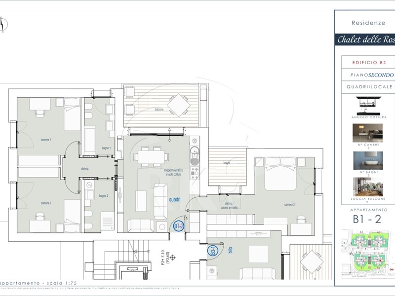 UNITA' B1-2: Ingresso su ampia zona giorno con angolo cottura e terrazza abitabile arredata con fioriera, 3 camere da letto e due bagni più cantina. E’ possibile acquistare un box auto nel piano seminterrato servito da ascensore.