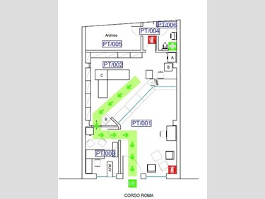L'unità immobiliare è composta da: ingresso, open-space suddiviso da pareti vetrate con sportelli, zona di attesa al pubblico, uffici, servizio igienico e archivio. L'unità immobiliare presenta tre vetrine su strada pubblica.