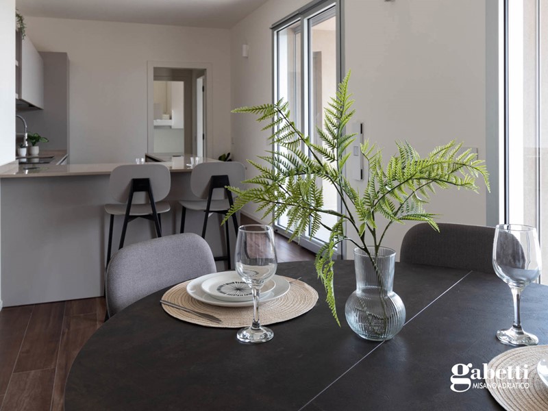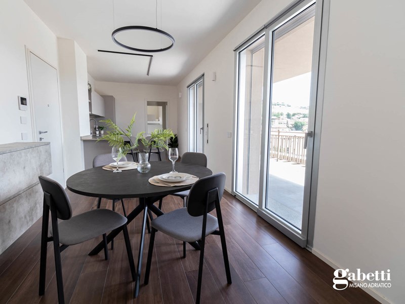 I confort di questa proprietà si completano grazie all'accesso allo splendido terrazzo panoramico con piscina e giardino pensile dal quale si possono ammirare Gradara e il suo Castello, il parco naturale del Monte San Bartolo e il profilo delle iconiche torri di San Marino.