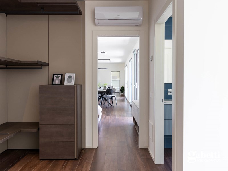 L'abitazione, completa di arredi di design, si sviluppa su una superfice di 100mq ed è composta da una luminosa zona giorno con cucina a vista, una camera padronale con cabina armadio e bagno privato, una camera e un secondo bagno.