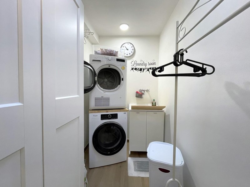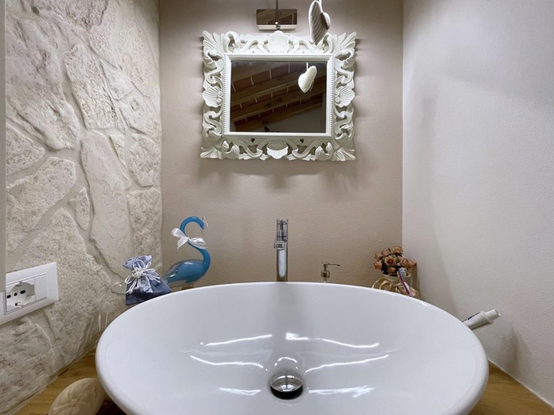 La casa si sviluppa su due piani. Al piano terra, l'ingresso si apre su un ampio soggiorno suddiviso in angolo cottura, tinello e area soggiorno, illuminato da una grande finestra con una bellissima vista sul mare. Percorrendo il disimpegno si raggiunge la prima camera da letto al piano terra e un bagno moderno con doccia. A questo livello si trova anche una comoda lavanderia, perfettamente attrezzata.