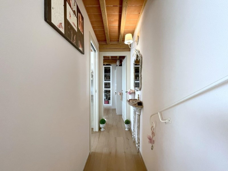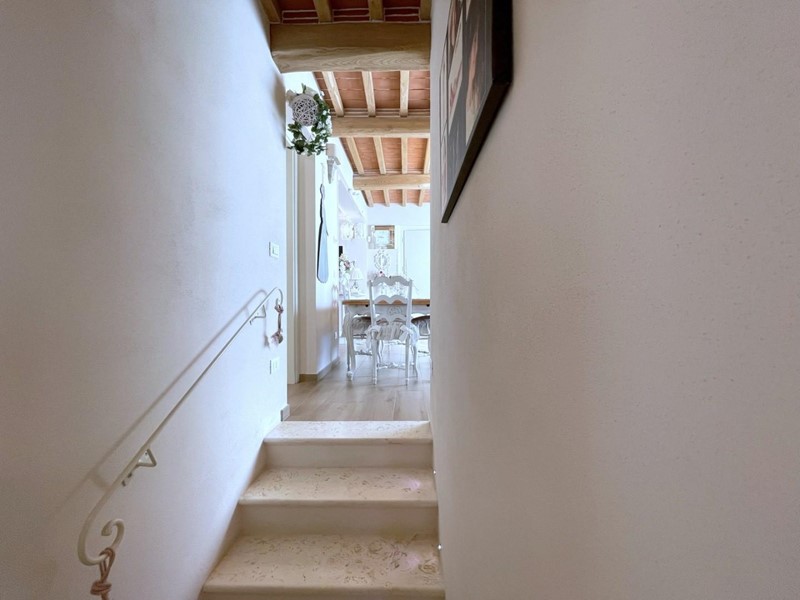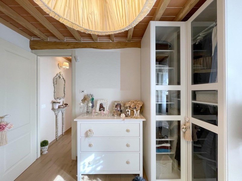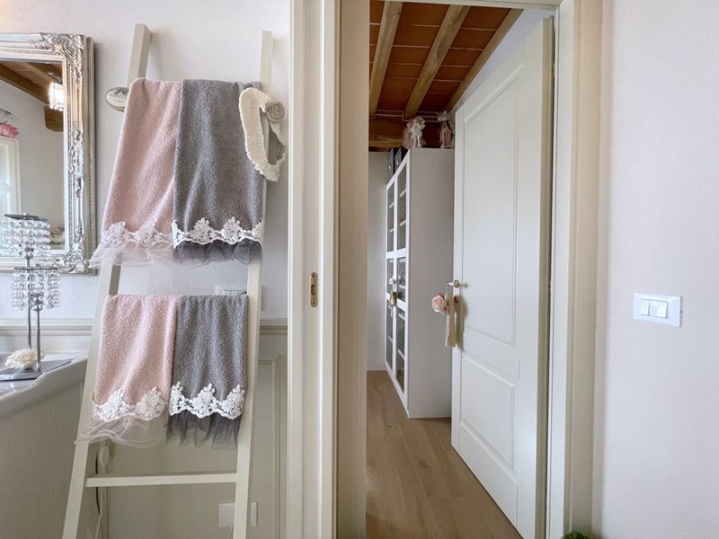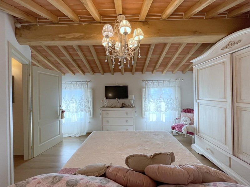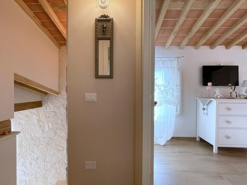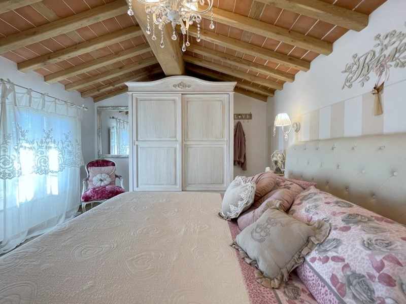 Salendo le scale, si arriva al piano superiore, interamente dedicato alla camera padronale. Questo spazio offre un rifugio accogliente con travi a vista e pavimenti in legno, oltre a un elegante bagno privato.