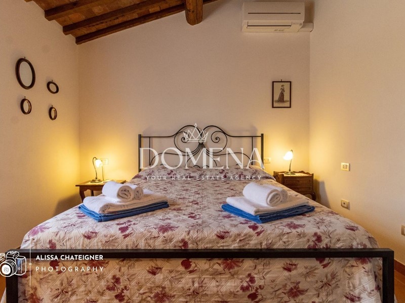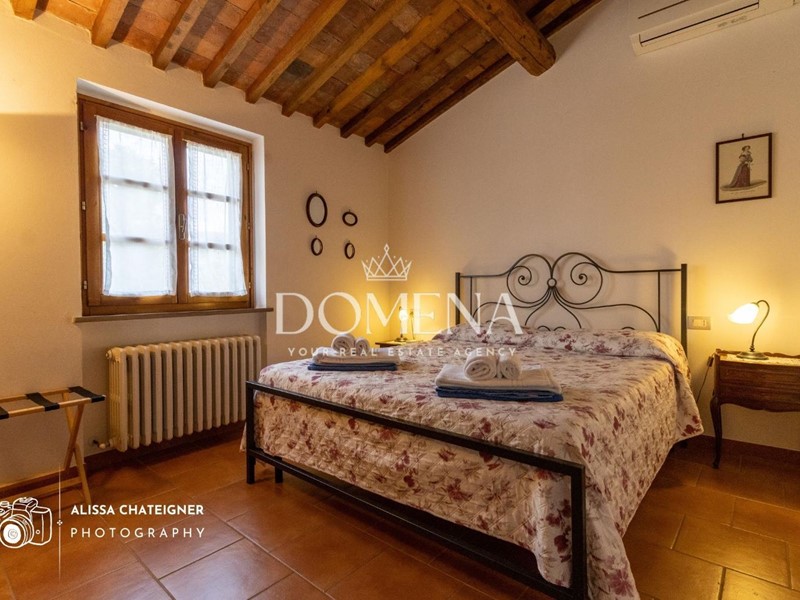 Il primo fabbricato recentemente ristrutturato è attualmente utilizzato per affitti turistici di alta qualità e si sviluppa su 2 livelli: a piano terra zona giorno con cucina e ampia e luminosa veranda con affaccio sulle due piscine e sul caratteristico paesaggio delle colline toscane, al piano primo sia con accesso interno tramite scala a chiocciola che esternamente tramite caratteristica scala in pietra troviamo un disimpegno/living, quattro camere e due bagni finestrati con box doccia. Completa il tutto al piano terra 2 magazzini collegati tra loro da poter utilizzare come ulteriore spazio fruibile.