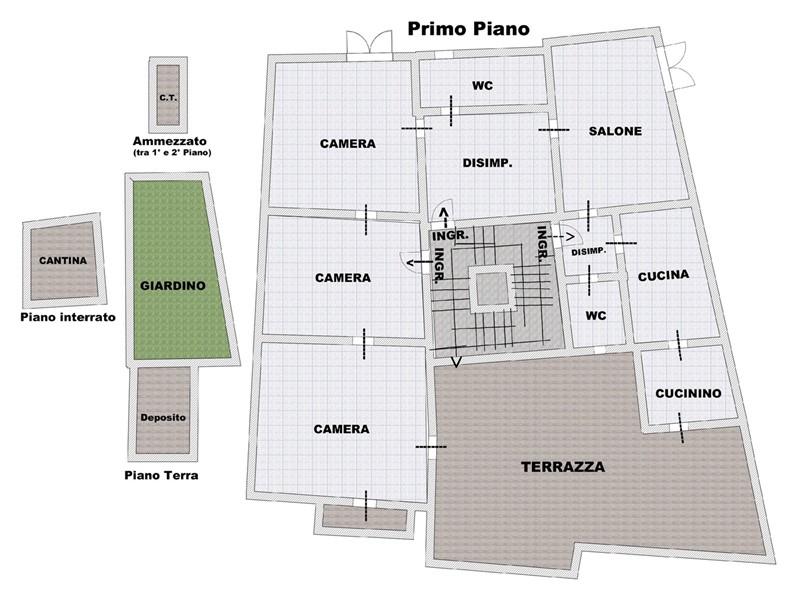 L' abitazione della superficie catastale di 230 mq escluse le aree scoperte, si presta alla possibilità di essere divisa, per la caratteristica di avere più accessi dal pianerottolo (unica sul piano) in cui è ubicata (n.b. da valutare la fattibilità di frazionamento con un tecnico). Non mancano gli spazi esterni tra cui un giardino a piano terra con annesso deposito, ed una terrazza a livello di primo piano. Al piano interrato vi è invece una cantina. Non mancano gli spazi esterni dove godersi le belle giornate.