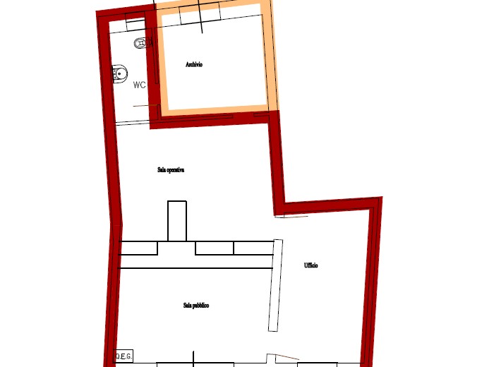L'interno è caratterizzato da un'ampia superficie open space divisa tra sala pubblico e sala operativa, un ufficio, oltre vano archivio e servizio igienico.