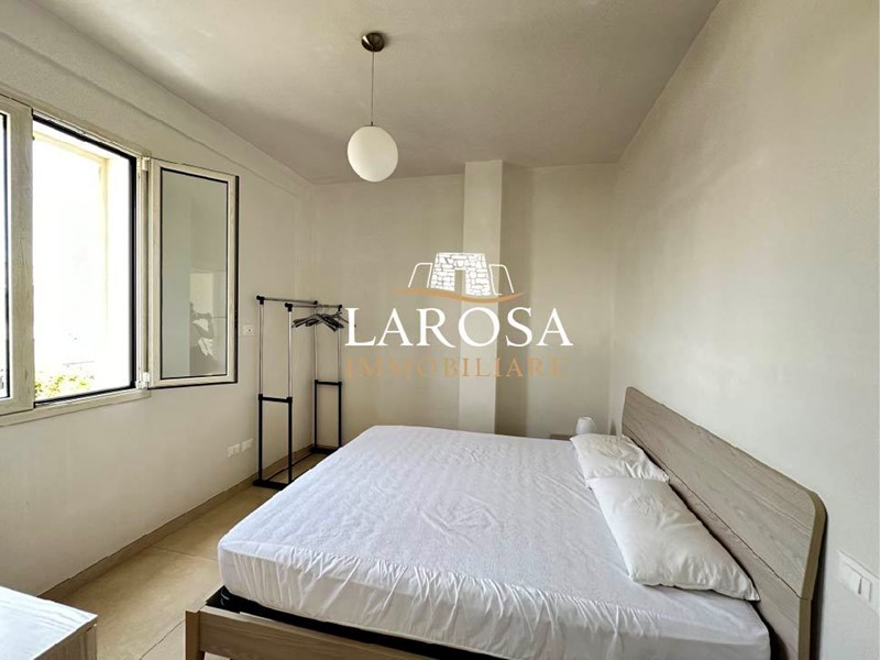 Il primo appartamento, accessibile tramite un cancello pedonale, ha una forma rettangolare e presenta una porta d'ingresso in doppio vetro/PVC, con persiane bianche esterne in PVC. Dispone di un ampio vano d'ingresso, adibito a camera da letto matrimoniale, con finestra che si affaccia sulla pubblica via, garantendo luminosità e raffinatezza. Un disimpegno conduce al bagno, dotato di doccia, sanitari e finestra, e a un angolo cottura con porta finestra che si apre sul cortile retrostante.