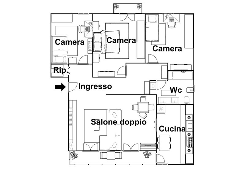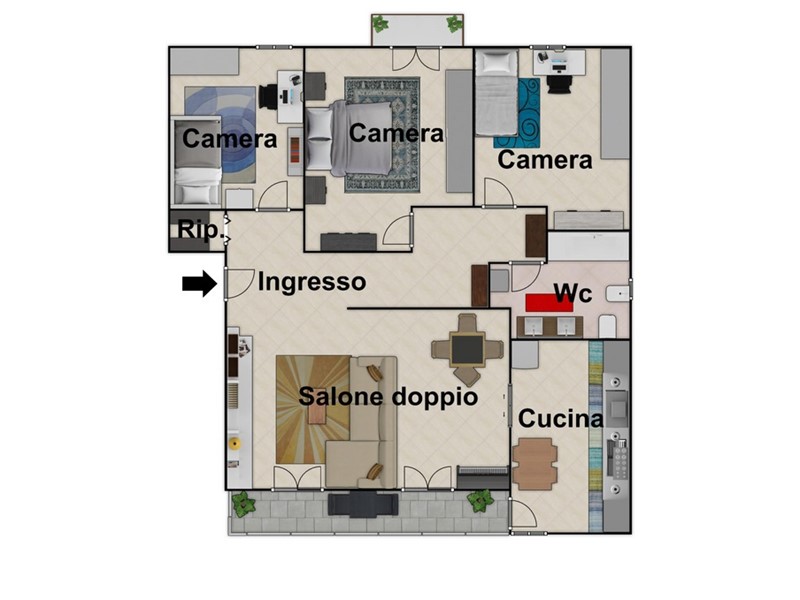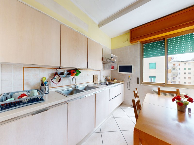 L'appartamento, posto al quarto ed ultimo piano di un condominio privo di ascensore, vanta una superficie commerciale di 125 mq. Al suo interno, gli spazi sono ben distribuiti su 93 mq utili, comprendendo un ampio ingresso, un luminoso salone doppio, tre camere da letto, una cucina abitabile, un servizio e un comodo ripostiglio.