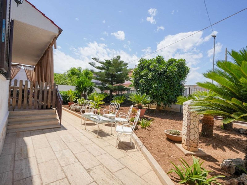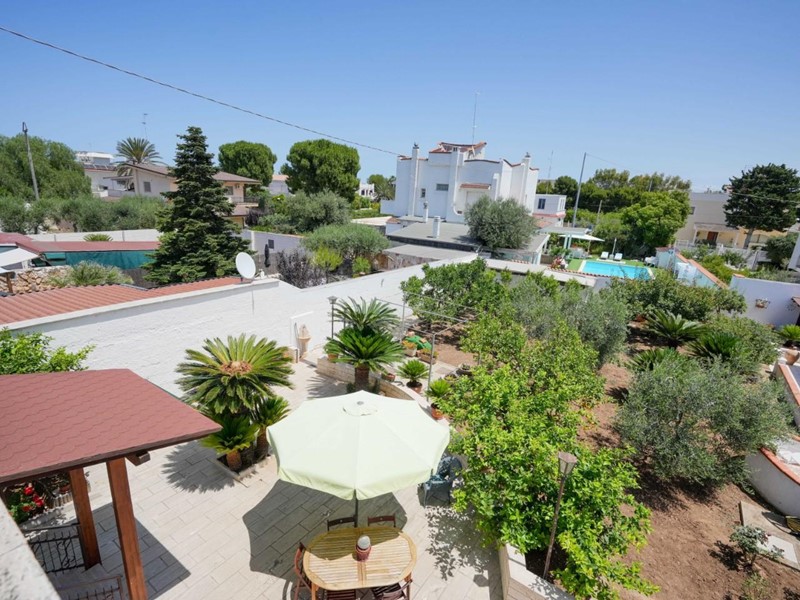 c) ampie zone comuni destinate in parte a patio pavimentato (utile per viabilità interna e parcheggio) ed in parte a giardino sapientemente curato e piantumato con alberi ornamentali e da frutto nonché barbecue, zone d’ombra e conversazione/relax, impianto di irrigazione.