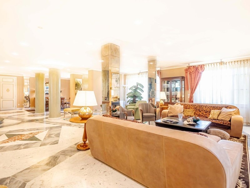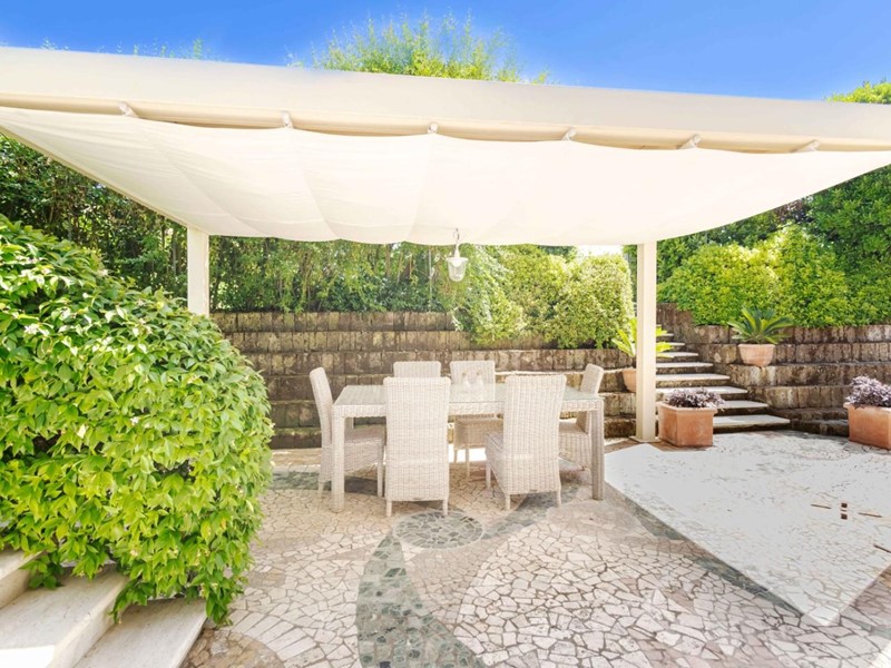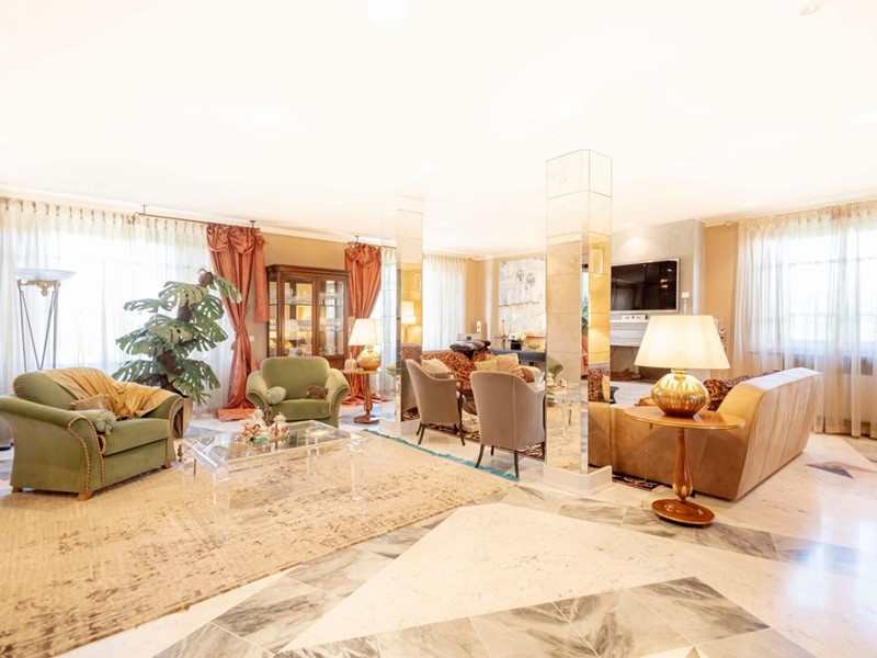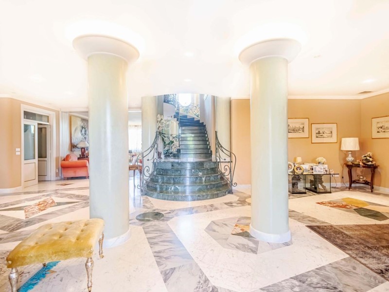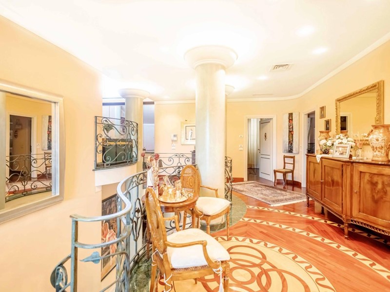 La prima unità è composta, al piano terreno rialzato, da doppio ingresso, zona living, sala da pranzo/cucina, studio e servizio igienico, la maestosa scala in marmo conduce al piano primo, ove sono collocate una master bedroom con guardaroba, bagno e terrazza con vista piscina, due camere matrimoniali ambedue con bagno e terrazza esclusivi, nel sottotetto lavanderia/stireria con terrazza. L'altra unità si compone, al piano terreno rialzato da ingresso su soggiorno, cucina abitabile con uscita verso la piscina, camera matrimoniale con bagno, cameretta, bagno e dispensa. Attraverso una moderna scala in acciaio, si accede al piano primo con zona living o terza camera con due terrazze, bagno ed alcuni vani di servizio.
