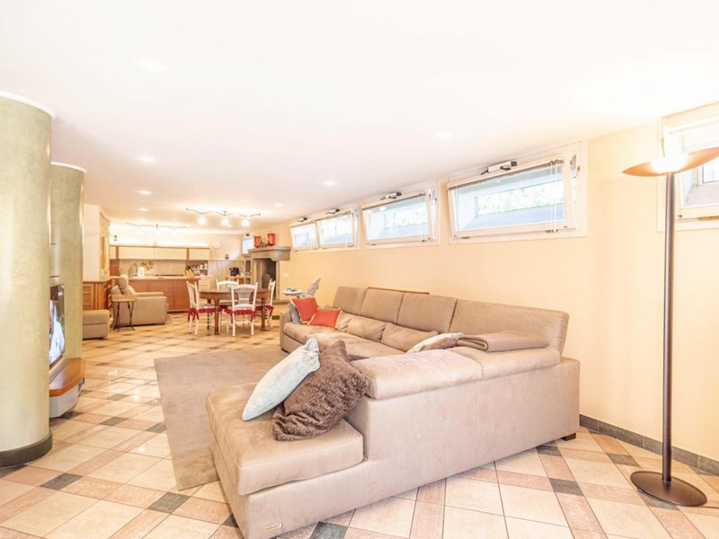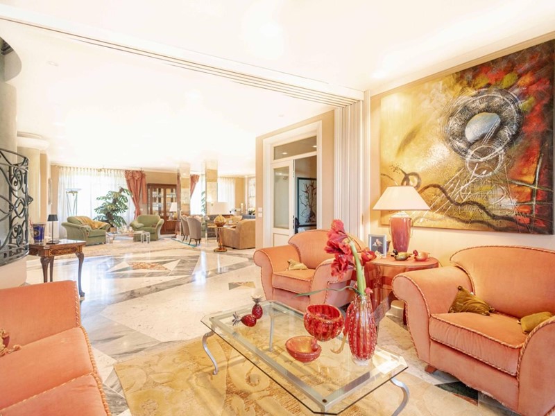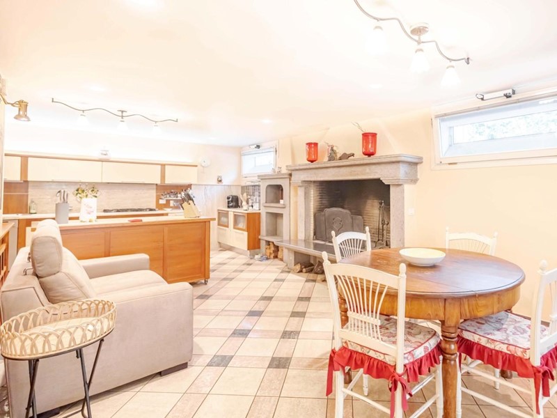 La villa si completa con una zona living con camino e con accesso diretto alla piscina, un garage triplo, un bagno, una camera ed altri vani di servizio.