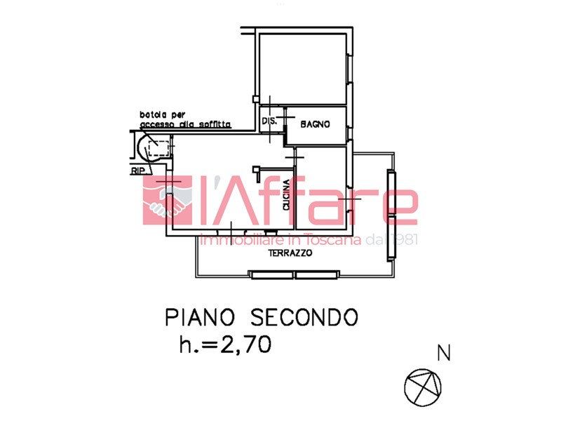 BUGGIANO - NS ESCLUSIVA - LOC. SANTA MARIA - VENDESI IN OTTIMO E RECENTE CONTESTO CONDOMINIALE, APPARTAMENTO POSTO AL SECONDO ED ULTIMO PIANO, LIBERO 3 LATI, PANORAMICO, SERVITO DA COMODO E MODERNO ASCENSORE ADATTO ANCHE PER DISABILI, COMPOSTO DA INGRESSO - SOGGIORNO CON ACCESSO AD AMPIO TERRAZZO ABITABILE, CUCINA, RIPOSTIGLIO, CAMERA MATRIMONIALE, CAMERETTA CON ACCESO AL TERRAZZO E BAGNO CON DOCCIA. CORREDATO DI POSTO AUTO ESCLUSIVO DI PROPRIETÀ’ E CANTINA. AREA LIVING CLIMATIZZATA, DOPPI VETRI, PORTONCINO BLINDATO. OTTIME CONDIZIONI. Le metrature inserite sono indicative e non effettive. Rich Euro 140.000 - Rif. 13543A - Ag. L'AFFARE Montecatini Terme 0572 773005. www.laffare.it - montecatini@laffare.it