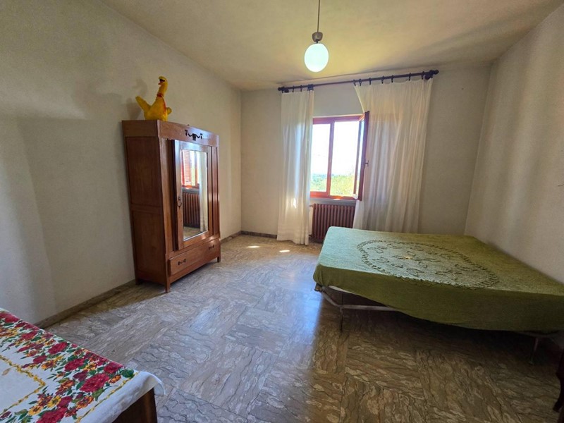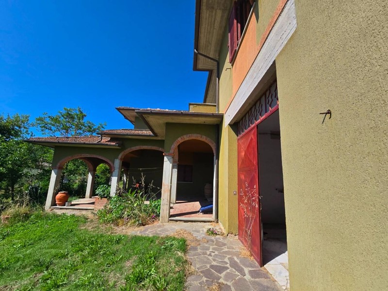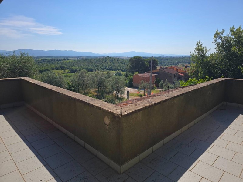 Nella periferia del paese di Monte San Savino Localita' Rigo porzione di casa bifamiliare di 330 mq circa su due livelli con terreno di 8000 metri circa con ulivi. E' composta al piano terra da cantine, garage, un bagno, locale tecnico e una cucina con camino, al piano primo salendo la scala interna troviamo un ingresso, cucina abitabile con ripostiglio e balcone con vista del castello di Gorgonza, soggiorno con terrazza che affaccia sulla Valdichiana, tre camere matrimoniali, due bagni di cui uno e' al grezzo da finire. C'e' il pozzo per l'acqua e il riscaldamento e' a gasolio. rif 32672