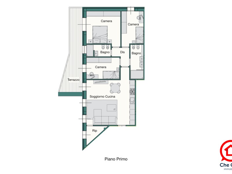 L’unità A4 è un quadrilocale caratterizzato da un terrazzo ampio ed abitabile in cui mangiare o rilassarsi. Internamente troviamo una una comoda zona giorno di oltre 29 mq calpestabili, molto luminosa grazie a tre ampie finestre e porte finestre, ripostiglio finestrato. La zona notte offre tre camere da letto e due bagni.