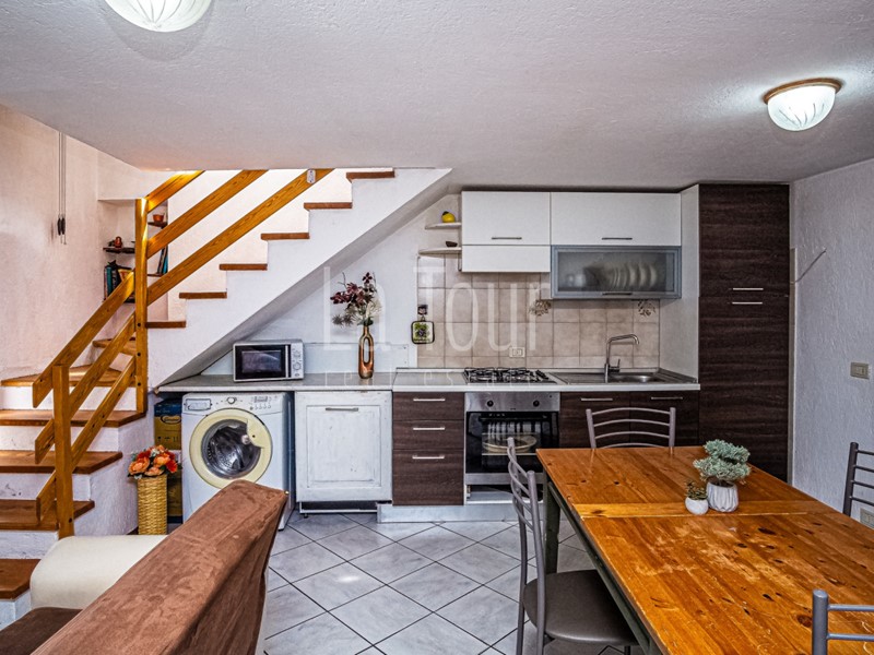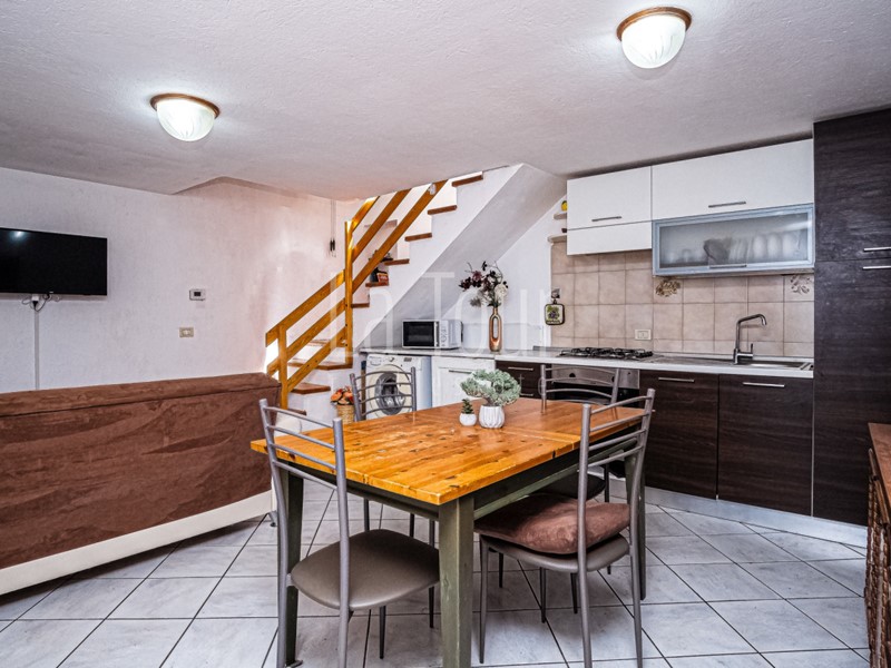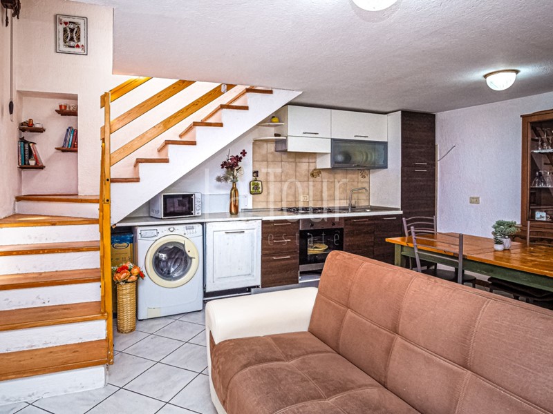 L'appartamento che si estende verso il basso si configura come segue: al piano principale, si apre un'area living con angolo cottura integrato. Il livello mezzanino, accessibile mediante una scala interna, ospita un disimpegno che funge da elemento distributivo tra due camere da letto - una matrimoniale e una doppia - e un ampio vano bagno, dotato sia di vasca che di box doccia.