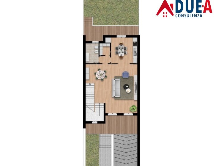 piano terra di 77mq soggiorno, cucina, bagno, due balconi