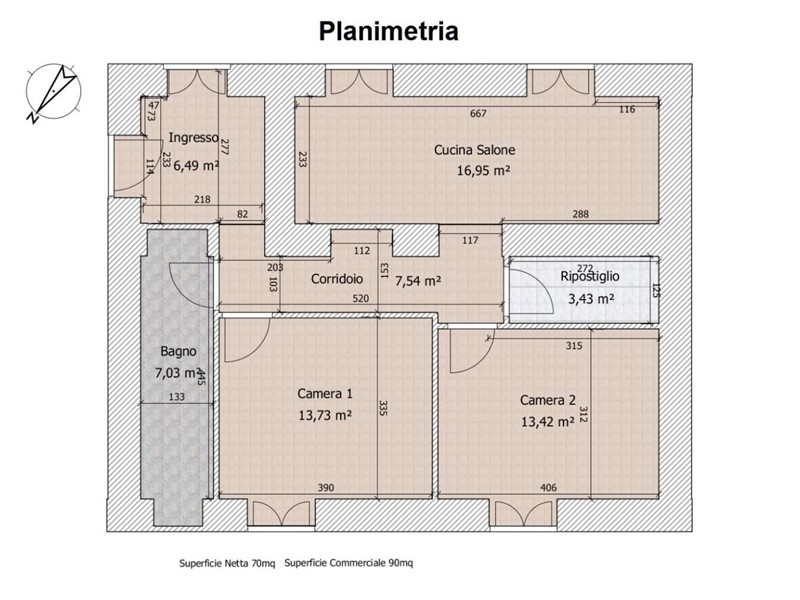 Due Camere da letto Matrimoniali, Ampio Salone con Cucina, Bagno, Corridoio, Ingresso, Ripostiglio.