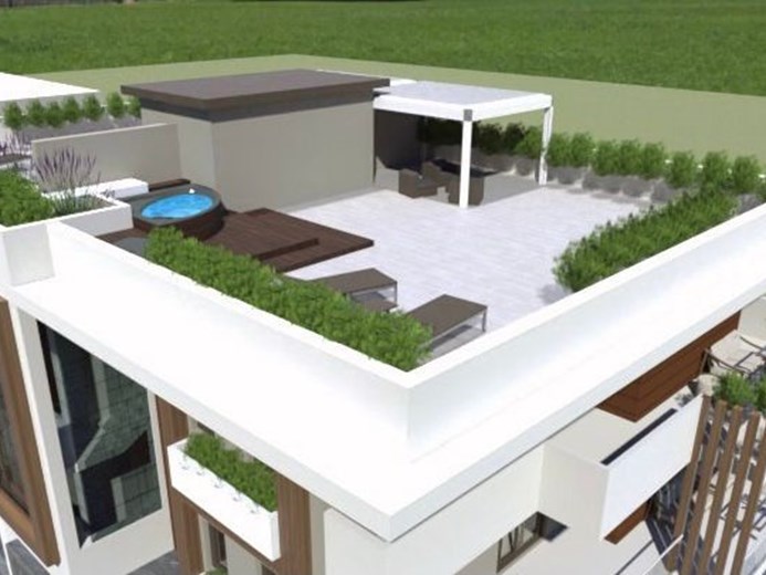 cucina living e salone, due camere da letto, due bagni, terrazzo superiore di 150mq e box auto di 25mq.