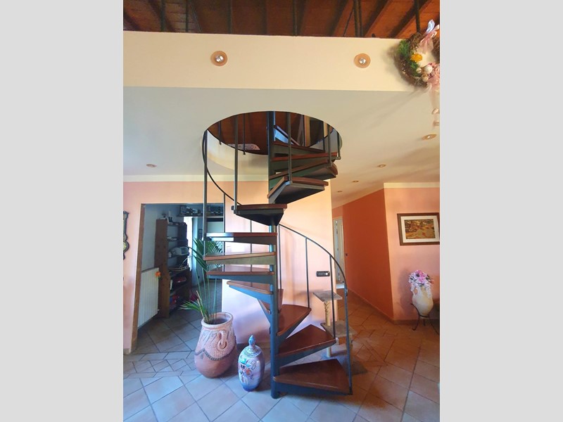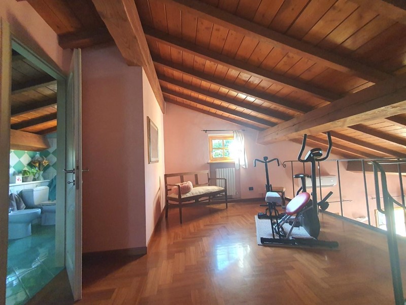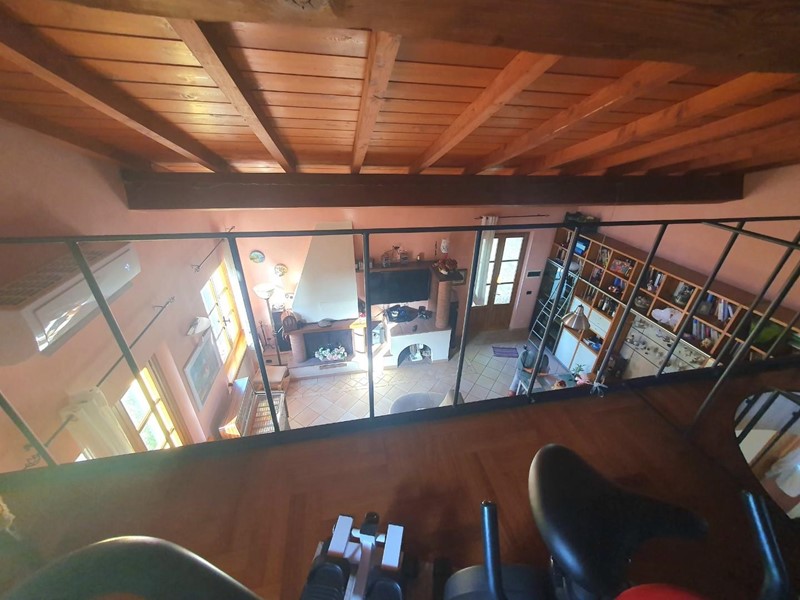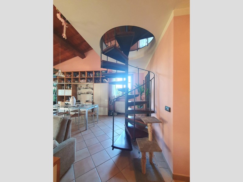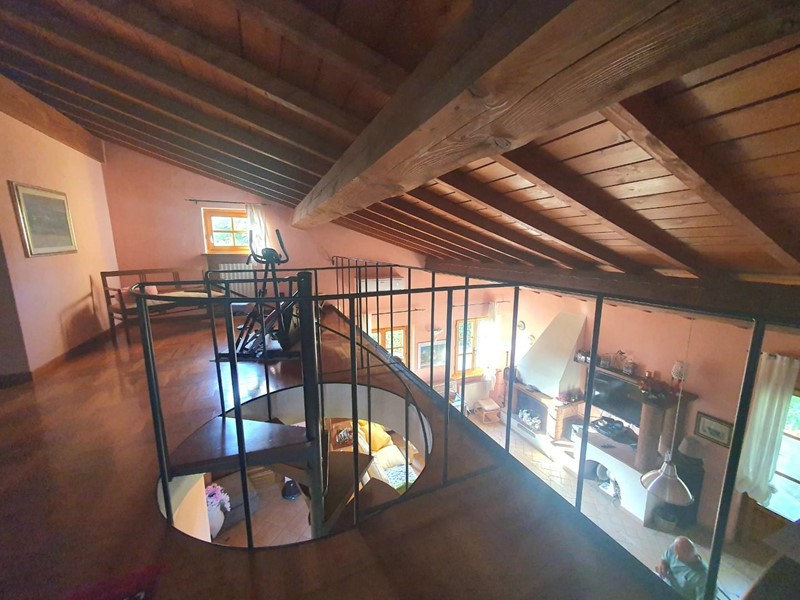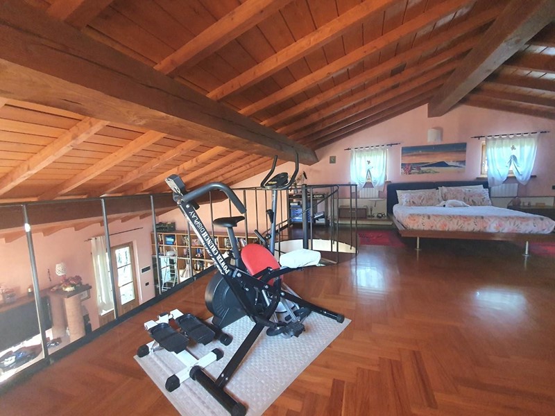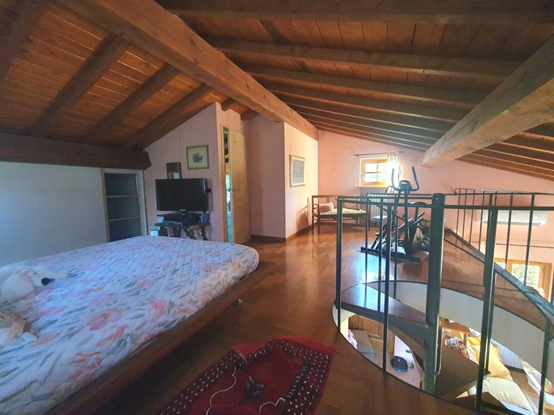 Da un'ampia scala a chiocciola di design si accede al soppalco in legno che domina il soggiorno, qui è presente un'altra camera con armadio su misura, un angolo allenamento e un bagno finestrato con vasca idromassaggio.