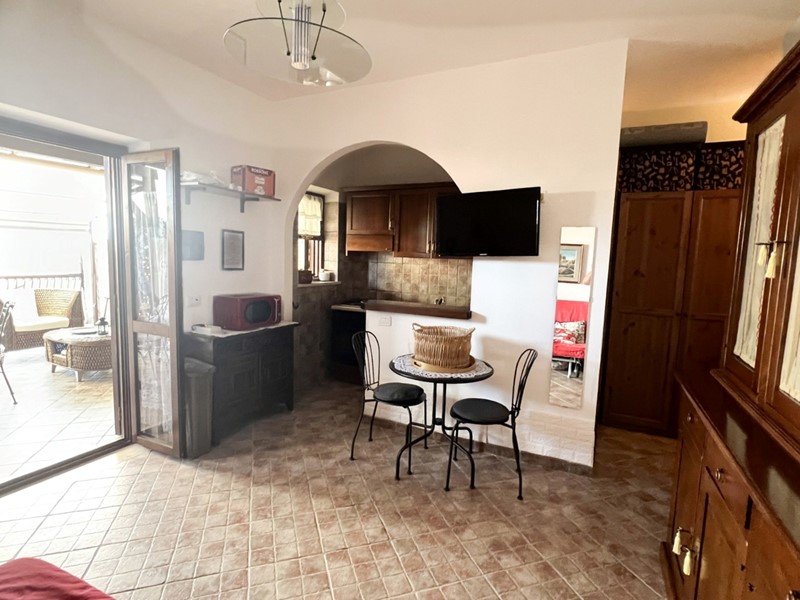 L'immobile è composto da un ampio terrazzo con vista mare, perfetto per momenti di relax all'aria aperta, un luminoso soggiorno con camino e angolo cottura, disimpegno, bagno, e due camere da letto, di cui una matrimoniale. Nella parte retrostante dell'appartamento si trova una veranda con un secondo bagno, ideale per maggiore comodità.