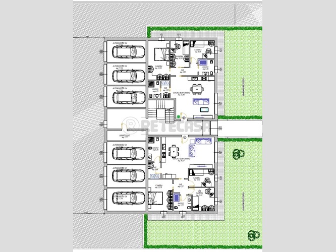 Ogni appartamento al piano terra sarà composto da: ingresso, soggiorno con angolo cottura, disimpegno, 2 bagni e 3 camere da letto oltre agli accessori precedentemente elencati.