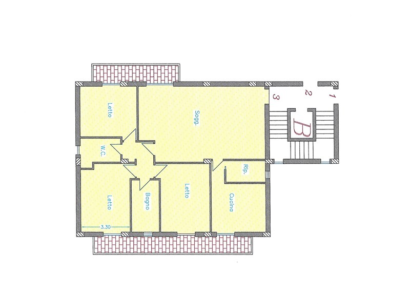 Ottima esposizione al sole, con balconi spaziosi e soleggiati e ampie finestre, predisposizione per n. 2 bagni, cucina attigua al soggiorno, salone, 3 camere da letto, ripostiglio.
