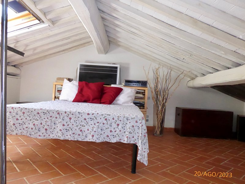 Ingresso da un terrazzo pavimentato , cucina abitabile con penisola, zona soggiorno , bagno con doccia, salendo al piano superiore troviamo open space con parquet, armadi a muro, camera mansardata, altro bagno, lavanderia e altri vani sottotetto, posto auto coperto e garage condominiale.
