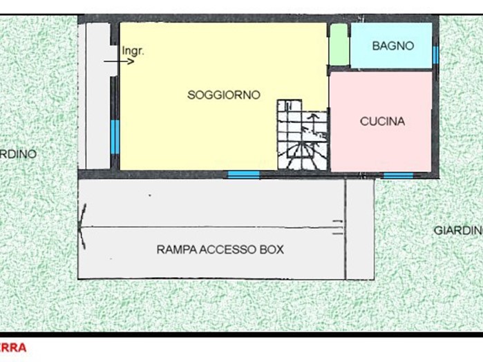 PIANO TERRA: ingresso, salone, cucina abitabile (con uscita sul giardino), bagno.