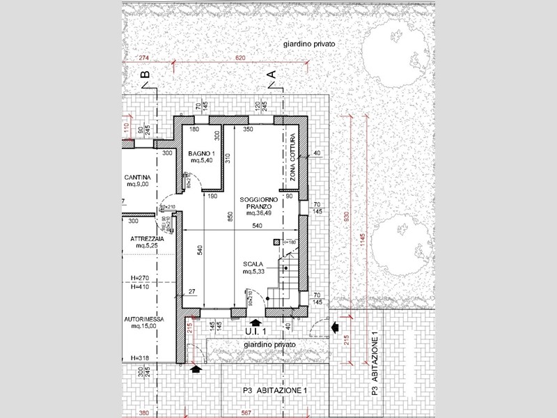 Ingresso indipendente dal giardino privato di mq.155 circa, soggiorno con angolo cottura (volendo con possibilità realizzo della cucina abitabile), tre camere (di cui una con guardaroba), tre bagni, balcone, cantina, due posti auto di proprietà ed ampia autorimessa.