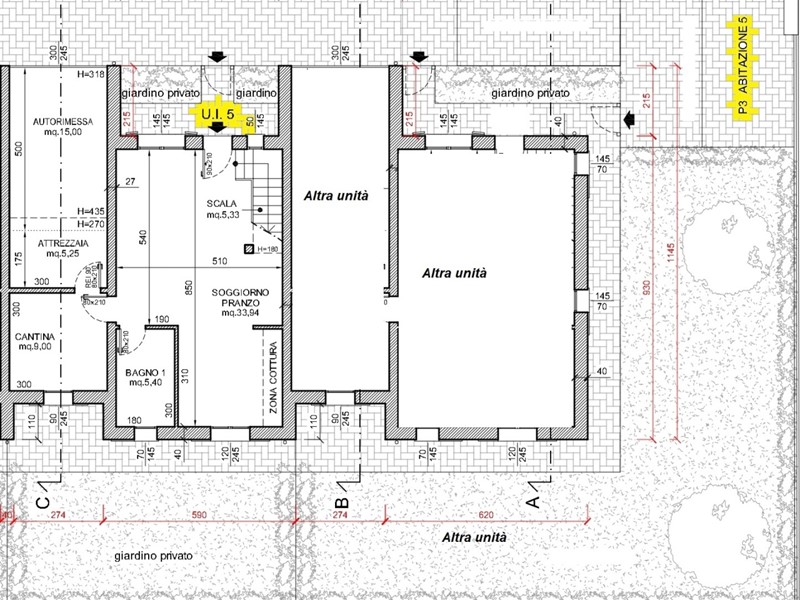 Ingresso indipendente dal giardino privato di mq.59 circa, soggiorno con angolo cottura (volendo con possibilità realizzo della cucina abitabile), due camere, due bagni, balcone, cantina, posto auto di proprietà ed ampia autorimessa.