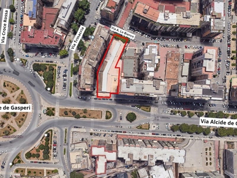 Piazza Alcide de Gasperi/ A. Lo Bianco - Luminoso corpo totalmente indipendente di mq 1250 c.a., doppio ingresso, con terrazzo di mq 1250 ad uso esclusivo con accesso da scala esterna. Composto da 21 camere di varia quadratura, una batteria di wc + un wc. Altezza tetti mt 5,00 c.a. Da ristrutturare. Attualmente uso ufficio (A/10) con possibilità di cambio con destinazione commerciale (C/1).