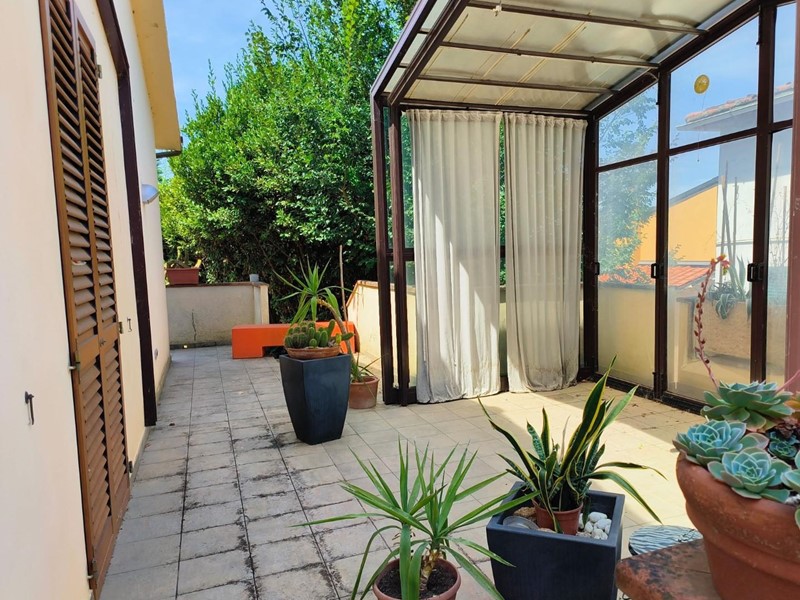 La Villa possiede esternamente una ampia zona piastrellata individuata come terrazza per una superficie totale di circa 62 mq. e nella parte più ampia, che combacia con la zona soggiorno del piano terra, è stata installata una struttura in vetro ed alluminio amovibile, che permette di realizzare un giardino d'inverno molto pratico e fruibile.