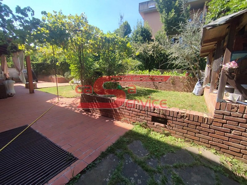 Il piano terra accoglie un ampio soggiorno con camino, una cucina abitabile con ripostiglio, tre camere, uno studio e due bagni. Un giardino esclusivo circonda l'appartamento su tre lati, garantendo privacy e tranquillità.
