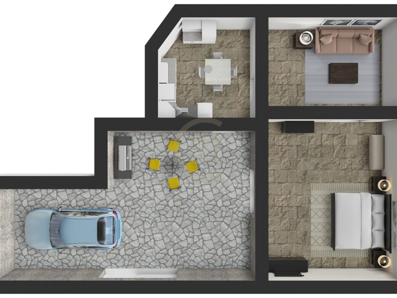 All’ingresso, un ampio portone in metallo introduce a un cortile privato, ideale non solo come spazio esterno da valorizzare, ma anche sufficiente per il parcheggio di un’auto utilitaria, aggiungendo praticità alla proprietà.
