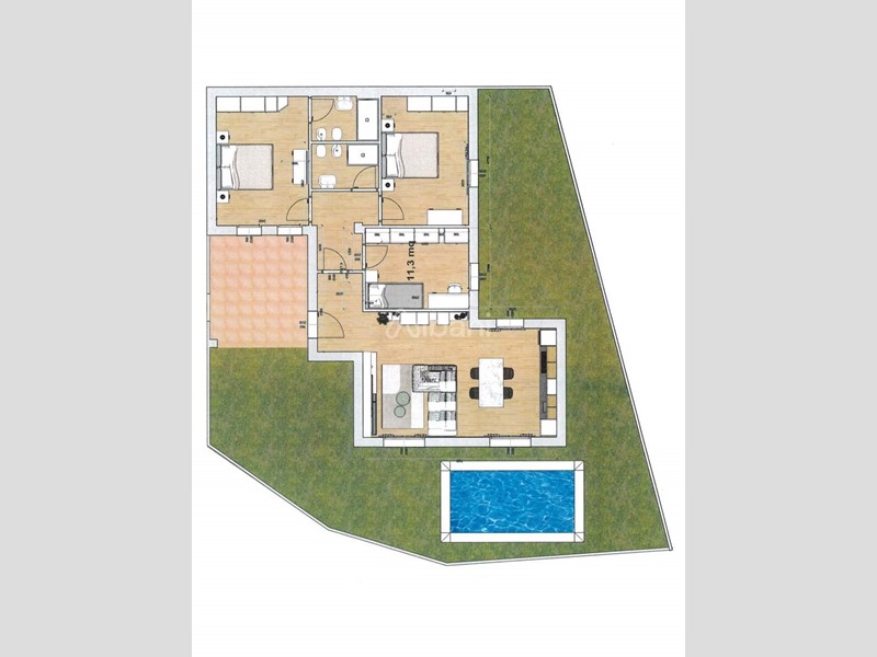 La loggia coperta fra giardino ed appartamento di mq 18, è chiudibile su gli ulteriori due lati sempre prospicenti il giardino già descritto. COMPRESO NEL PREZZO E IN FASE DI REALIZZAZIONE VASCA IDRO DI MQ. 15 DI PROPRIETA' ESCLUSIVA INSERITA NEL GIARDINO STESSO.