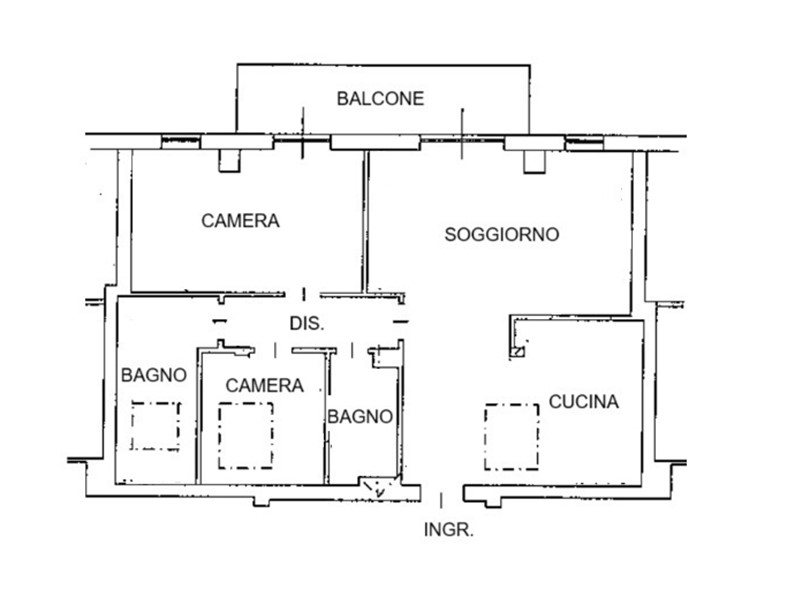 L'appartamento, servito da ascensore, è composto da ingresso nella luminosa zona giorno con cucina a vista e accesso al balcone, disimpegno conduce alla zona notte con camera matrimoniale anch'essa con accesso al balcone e camera singola oltre doppi servizi.