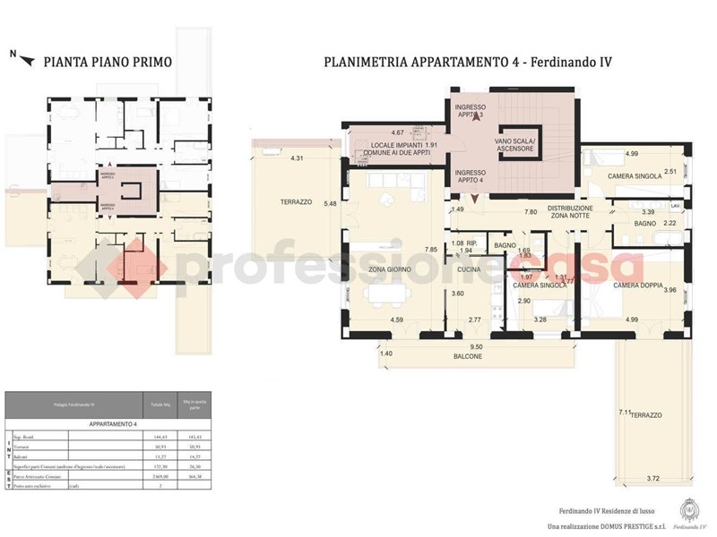 La residenza FERDINANADO IV situata al piano primo in palazzina di tre piani e parco attrezzato comune di 2370 mq, oltre 2 posti auto esclusivi. L'immobile, con metratura interna di circa 145 mq e rifinito nei minimi dettagli con materiali e finiture di alto pregio, è composto da: ingresso, zona giorno con affaccio su terrazzo costituita da salone, sala da pranzo, cucina con balcone e ripostiglio, zona notte con camera matrimoniale con affaccio su terrazzo, due camere singole di cui una con balcone, due servizi igienici.
