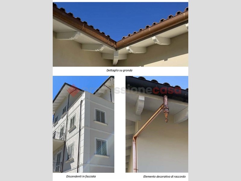 - Gronde, pluviali, ed elementi di raccordo in rame, arricchiti da elementi di decoro nei raccordi