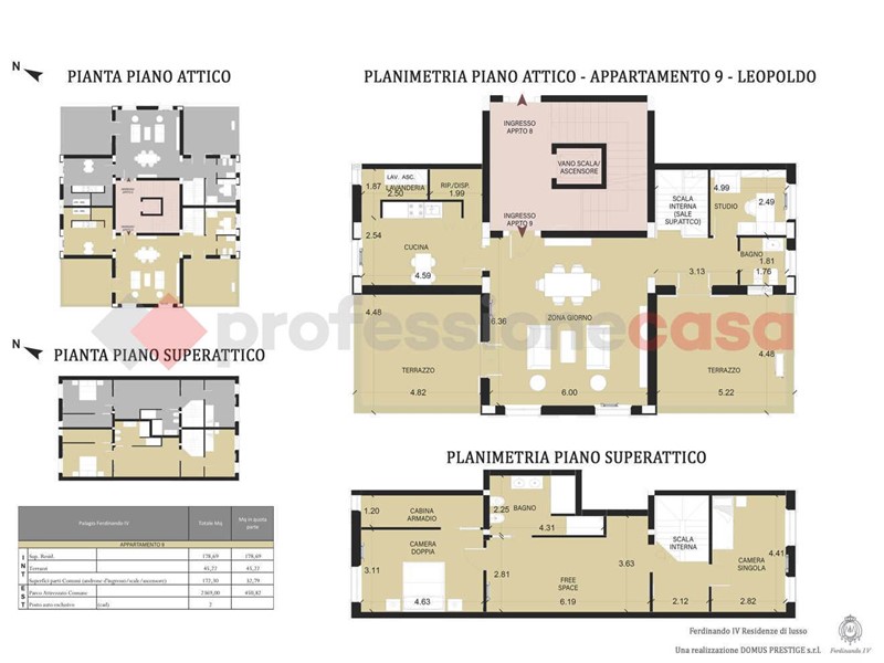 La residenza LEOPOLDO situata al piano terzo in palazzina di tre piani e parco attrezzato comune di 2370 mq oltre 2 posti auto esclusivi. L'attico è disposto su due livelli, con metratura interna di circa 180 mq e rifinito nei minimi dettagli con materiali e finiture di alto pregio, ed è composto da: ingresso in zona giorno con salone e sala da pranzo, cucina abitabile con dispensa e lavanderia, studio, bagno e due terrazzi panoramici; al piano super attico openspace, due camere da letto di cui una con cabina armadio e bagno.