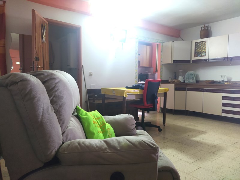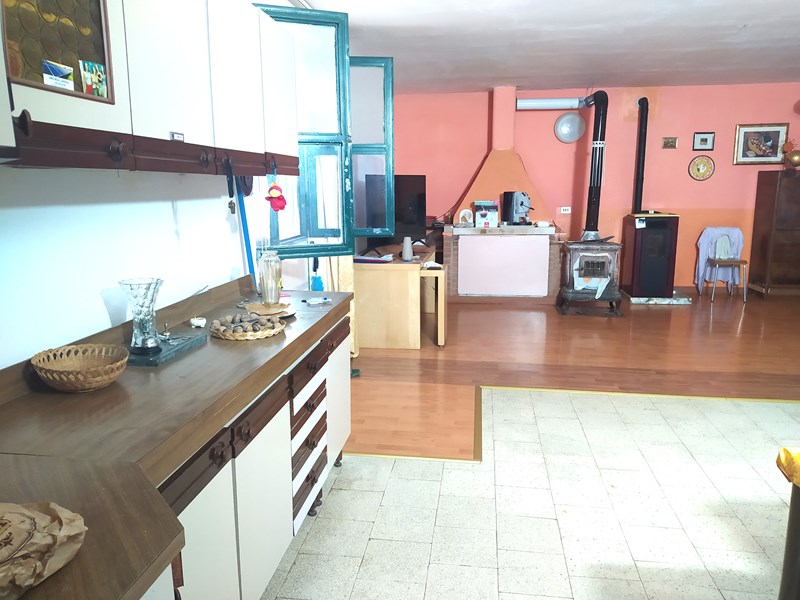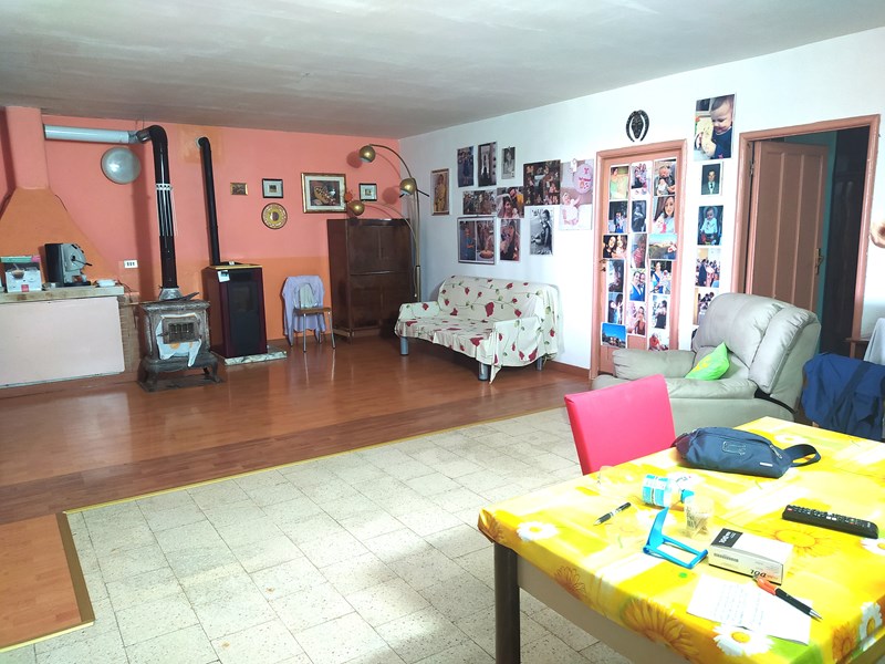 Ingresso in ampia sala con camino, angolo cottura, due camere da letto e bagno;
