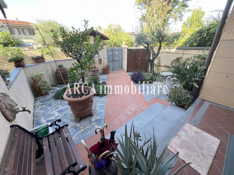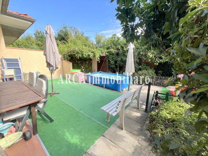 Pietrasanta villetta a schiera composta da ingresso-pranzo (ex cucina), servizio, saletta, cucina ab. al piano rialzato, 2 camere con balcone, cameretta e bagno al primo piano e taverna con accesso sia interno che esterno soggiorno-cottura, bagno e altro vano, ripsotiglio. Giardino sul davati e sul retro. termo singolo e aria condizionata. Buono lo stato di manutenzione.