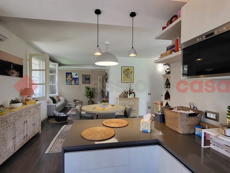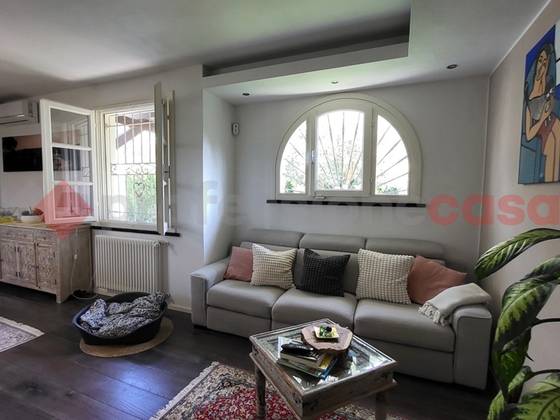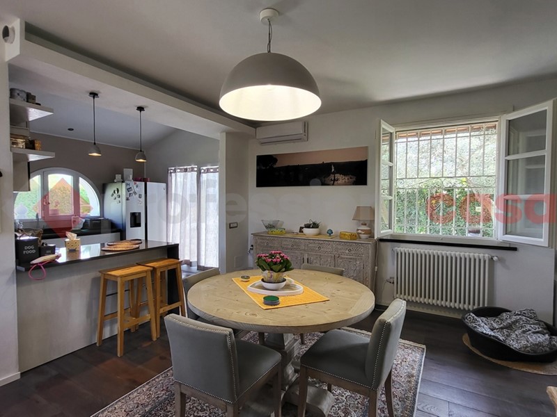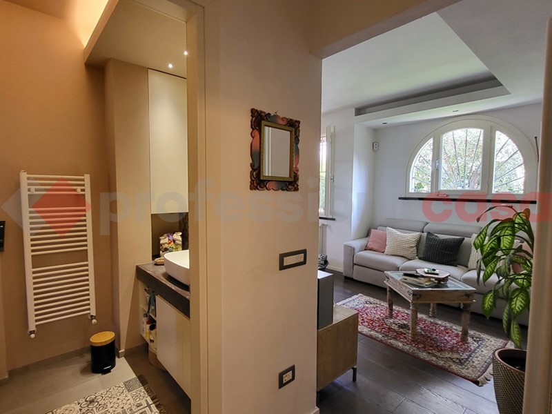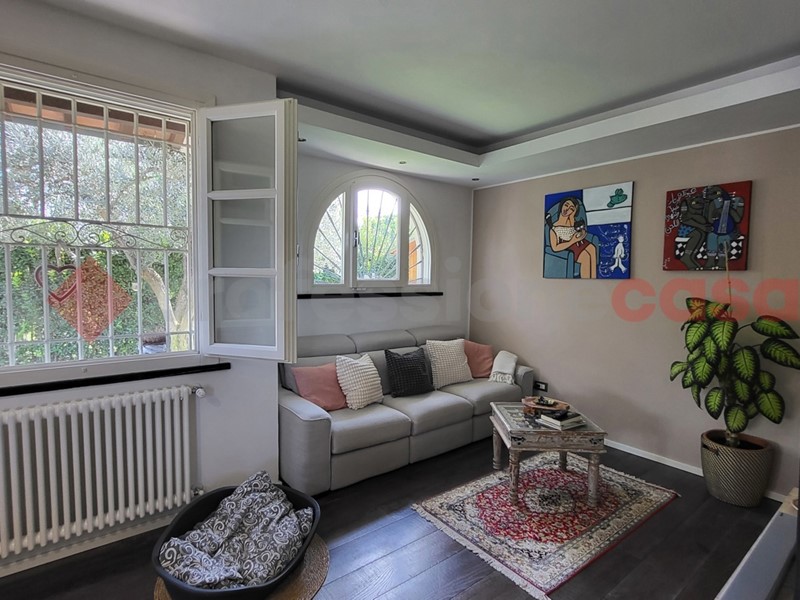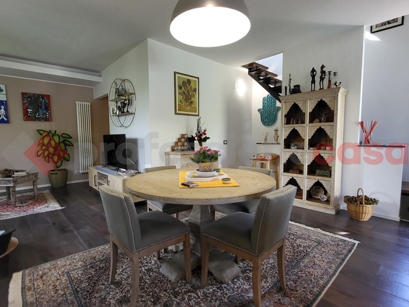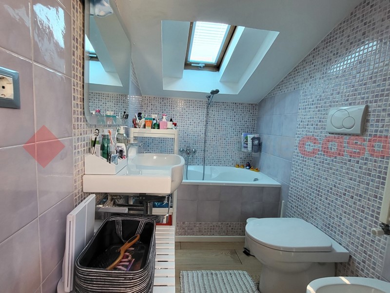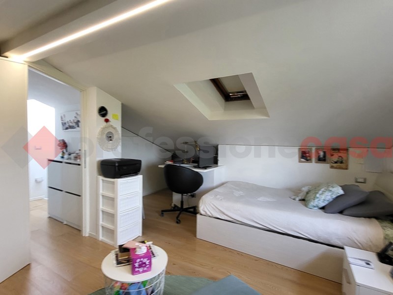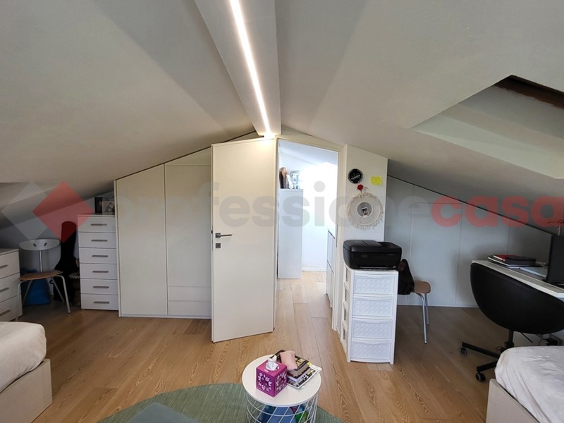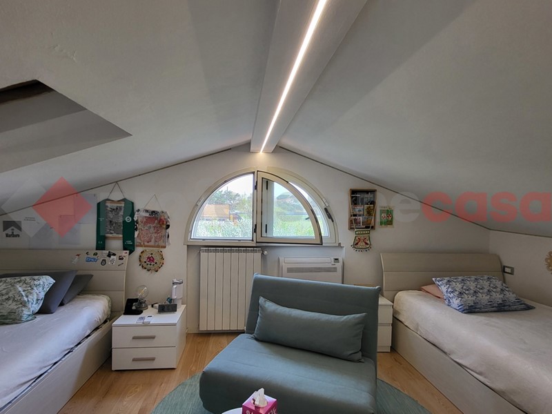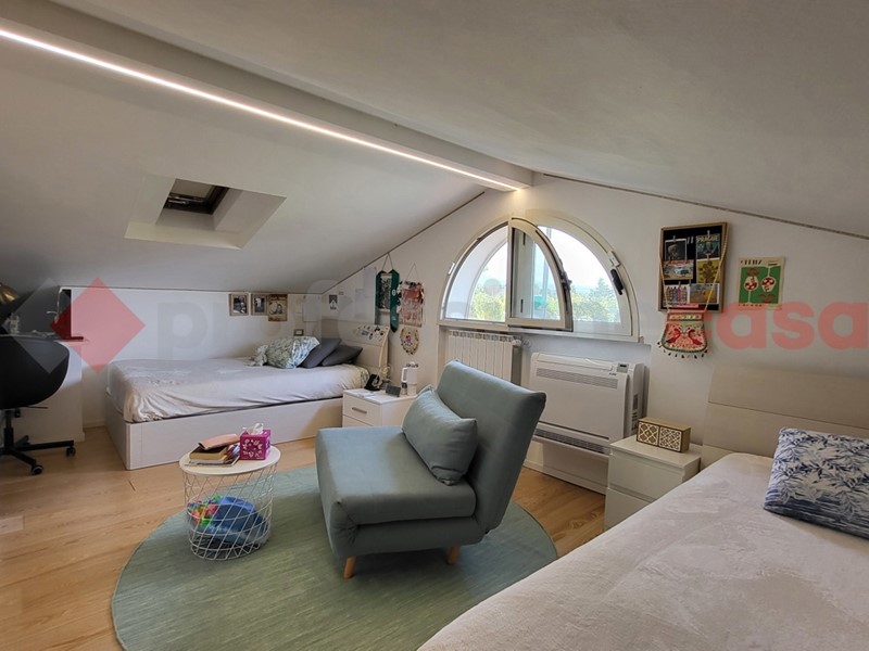 con stanza armadi, ripostiglio ed un comodo bagno; al piano interrato, l'autorimessa è stata adibita a grande taverna con camino e forno, cucina in muratura e grande tavolo in legno massello per cene e momenti conviviali con gli amici che possono condividere anche un'ampia zona relax composta da salotto e tv, oltre allo spazio esterno che riconduce al giardino, infine, completa il piano un bagno ed una comodissima lavanderia; la mansarda, anch'essa comunicante internamente come la taverna, è perfettamente sfruttata  ed adibita a doppia camera studio con servizio.
