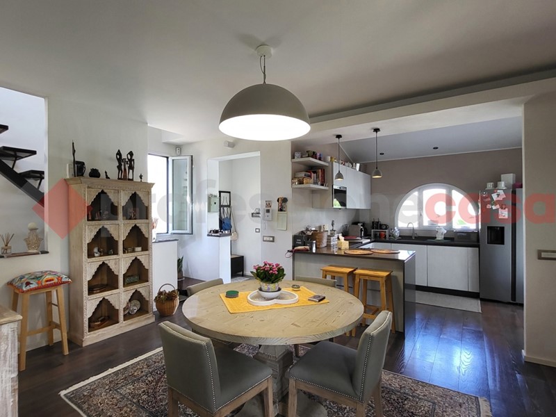 Disposta su tre livelli, al piano terreno troviamo una ampia e luminosa zona giorno composta da cucina con penisola, zona pranzo e soggiorno, una camera padronale
